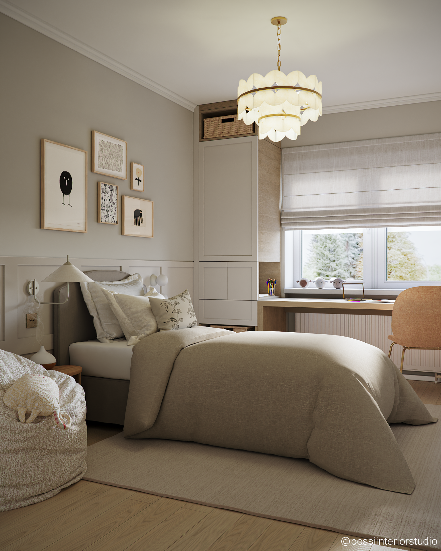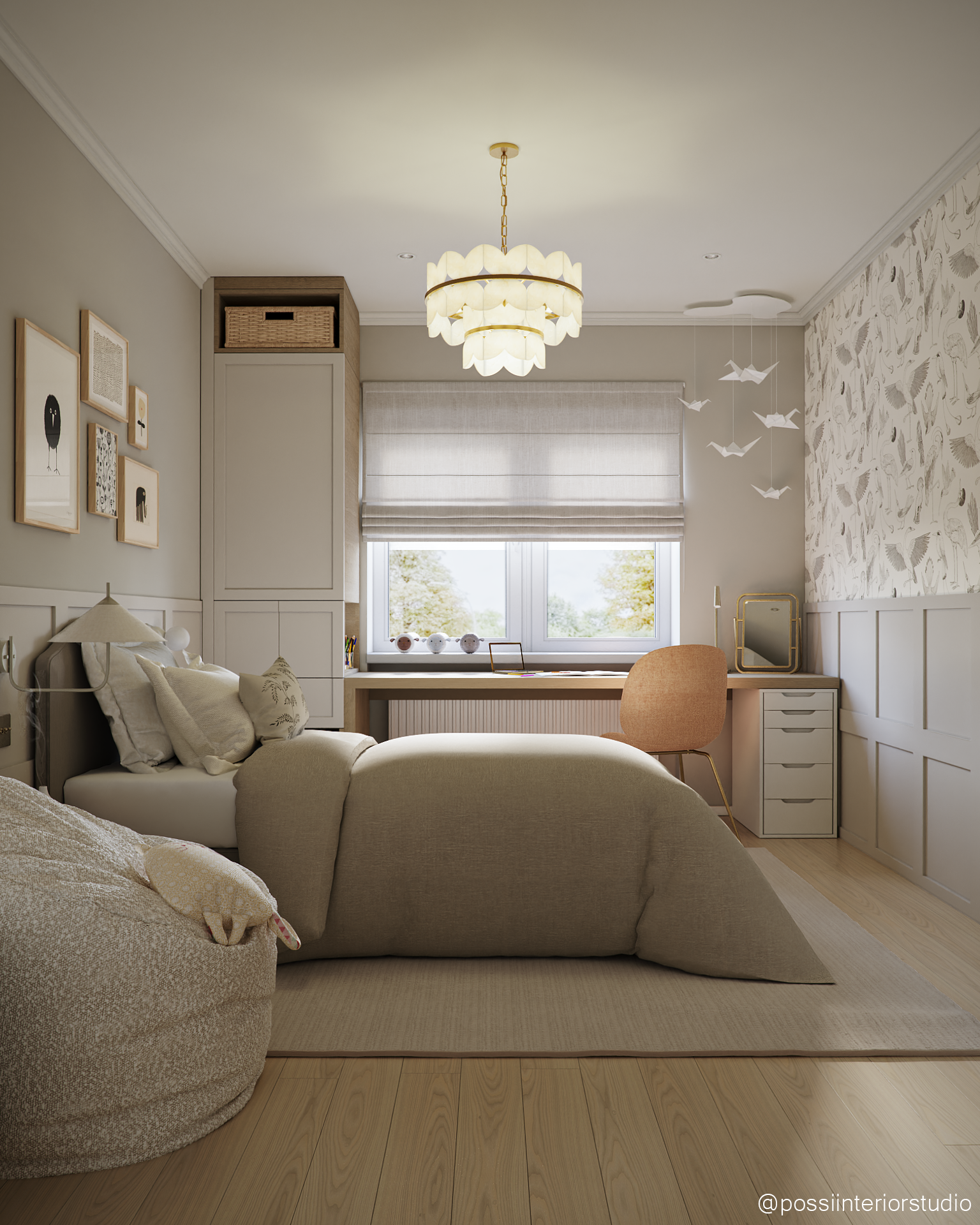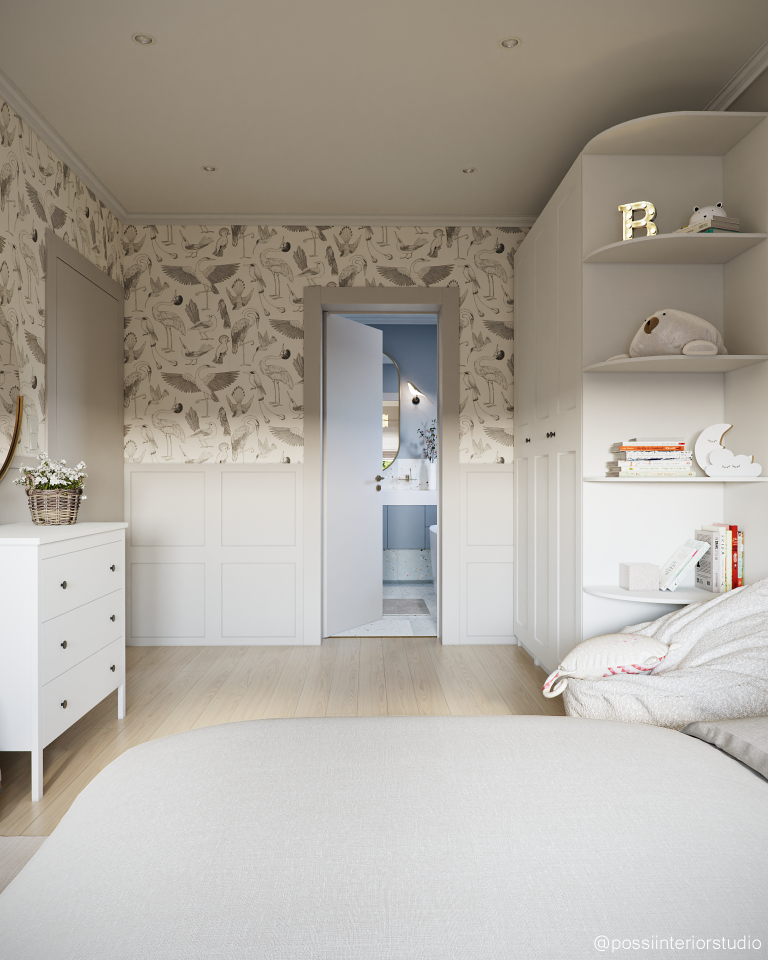 Das Zimmer wurde für ein Mädchen in der Pre-Adoleszenz entworfen und kombiniert eine leichte, stilvolle Atmosphäre mit neutralen Tönen in Beige und Weiß sowie warmen Holzelementen. Die Tierliebe zeigt sich in Tapeten und Accessoires, während der Gesamteindruck zeitlos und sanft bleibt. Hochwertige und zugängliche Möbel schaffen ein harmonisches, budgetfreundliches Ambiente. Das blaue Bad rundet das Konzept mit Holzdetails und funktionalem Design ab.