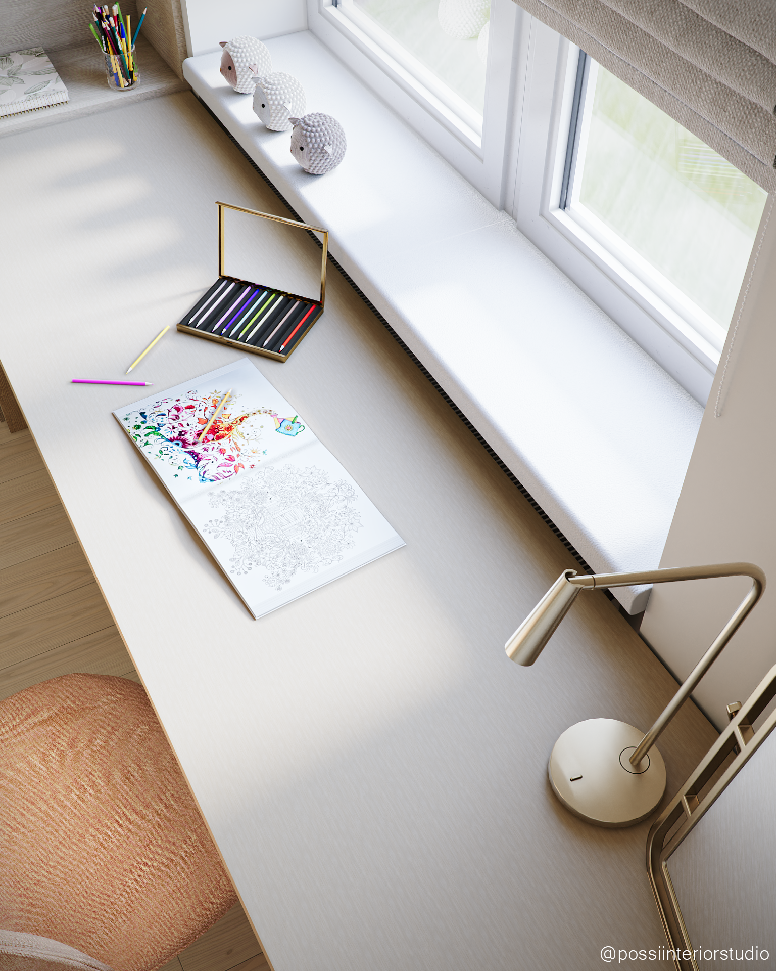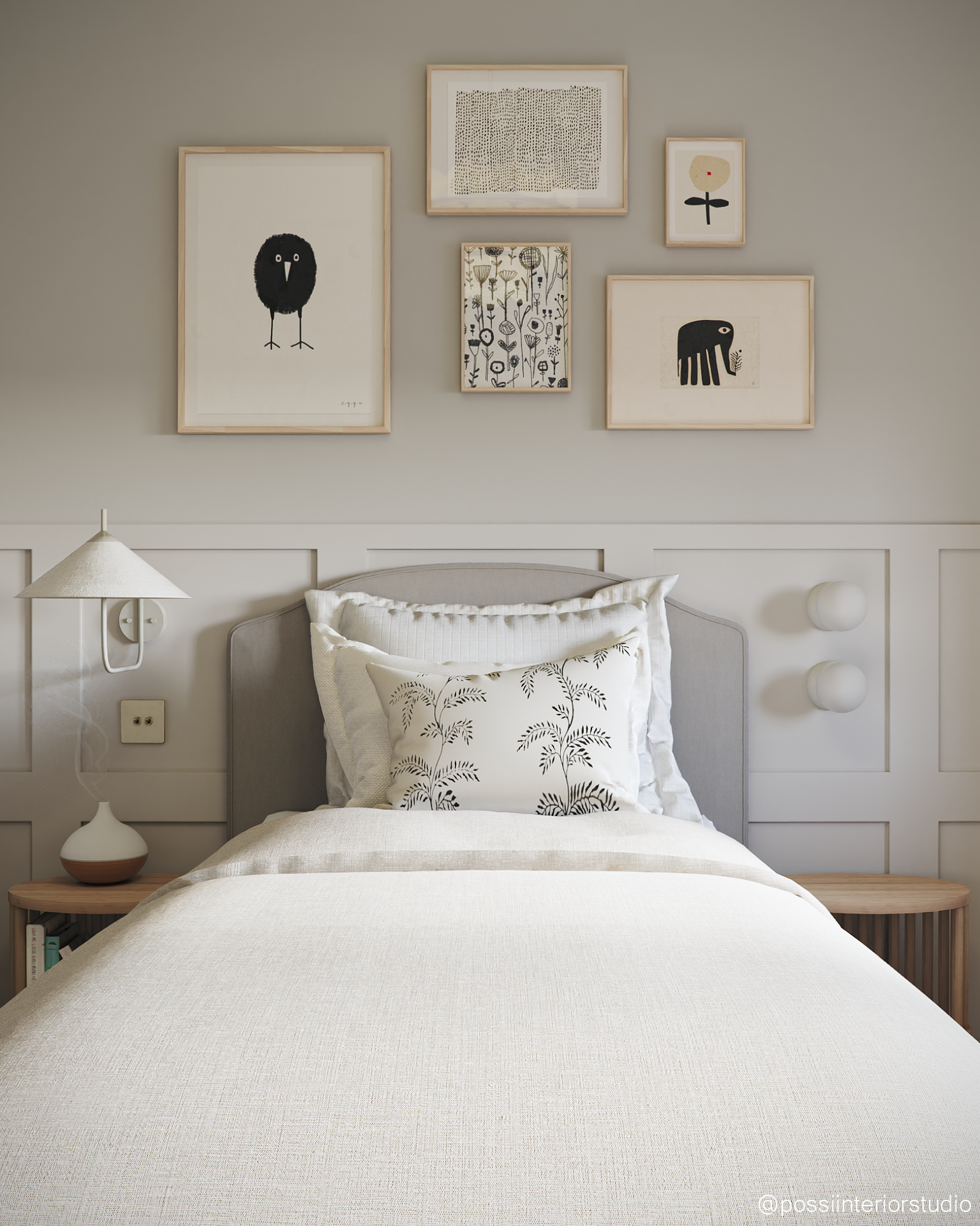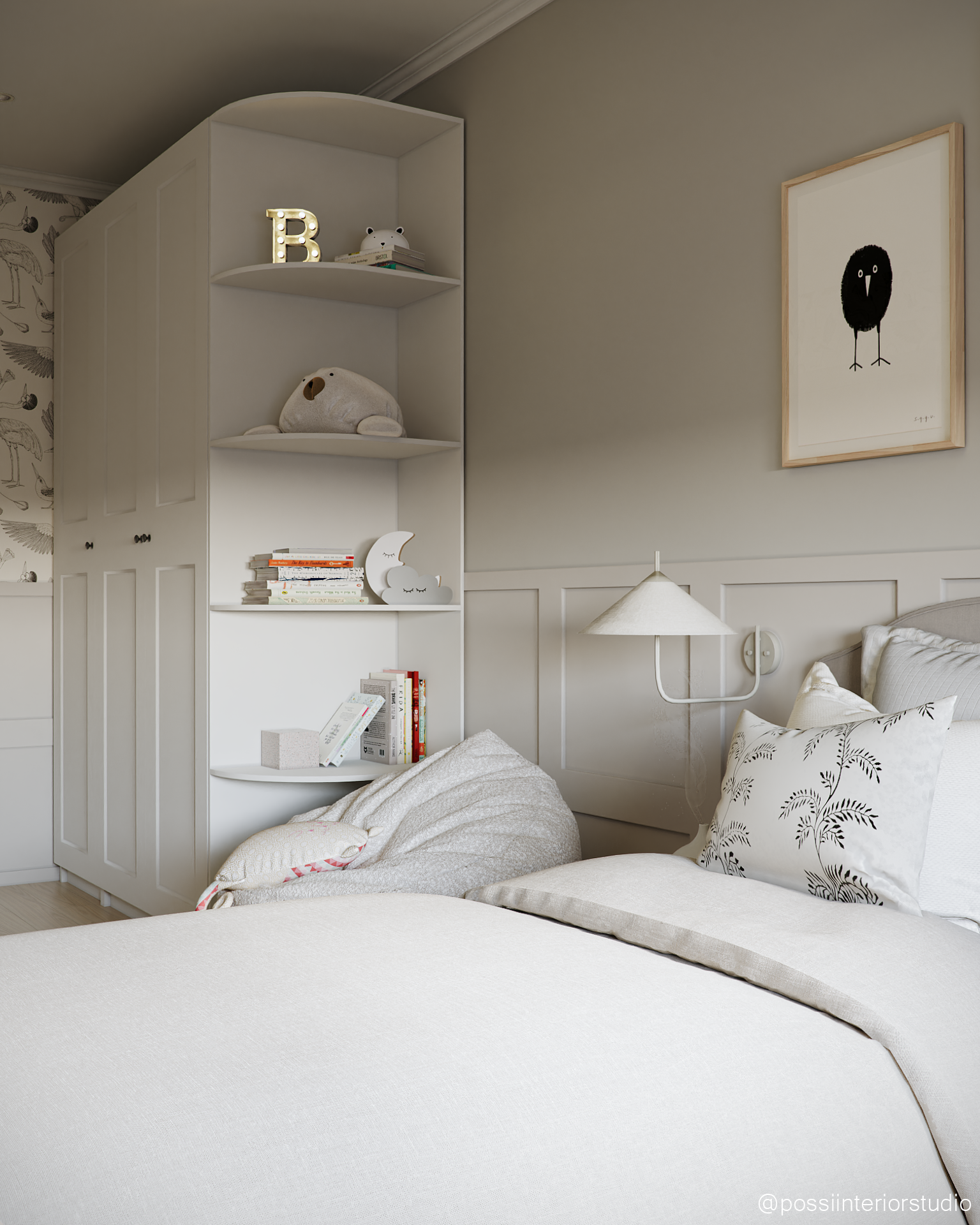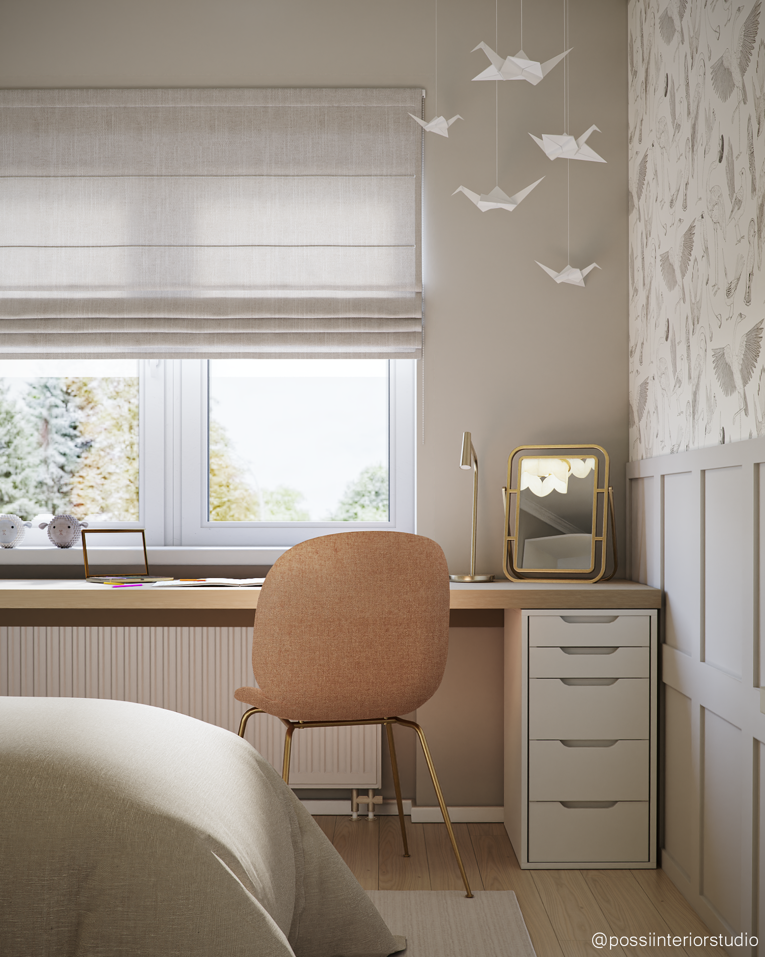 Das Zimmer wurde für ein Mädchen in der Pre-Adoleszenz entworfen und kombiniert eine leichte, stilvolle Atmosphäre mit neutralen Tönen in Beige und Weiß sowie warmen Holzelementen. Die Tierliebe zeigt sich in Tapeten und Accessoires, während der Gesamteindruck zeitlos und sanft bleibt. Hochwertige und zugängliche Möbel schaffen ein harmonisches, budgetfreundliches Ambiente. Das blaue Bad rundet das Konzept mit Holzdetails und funktionalem Design ab.