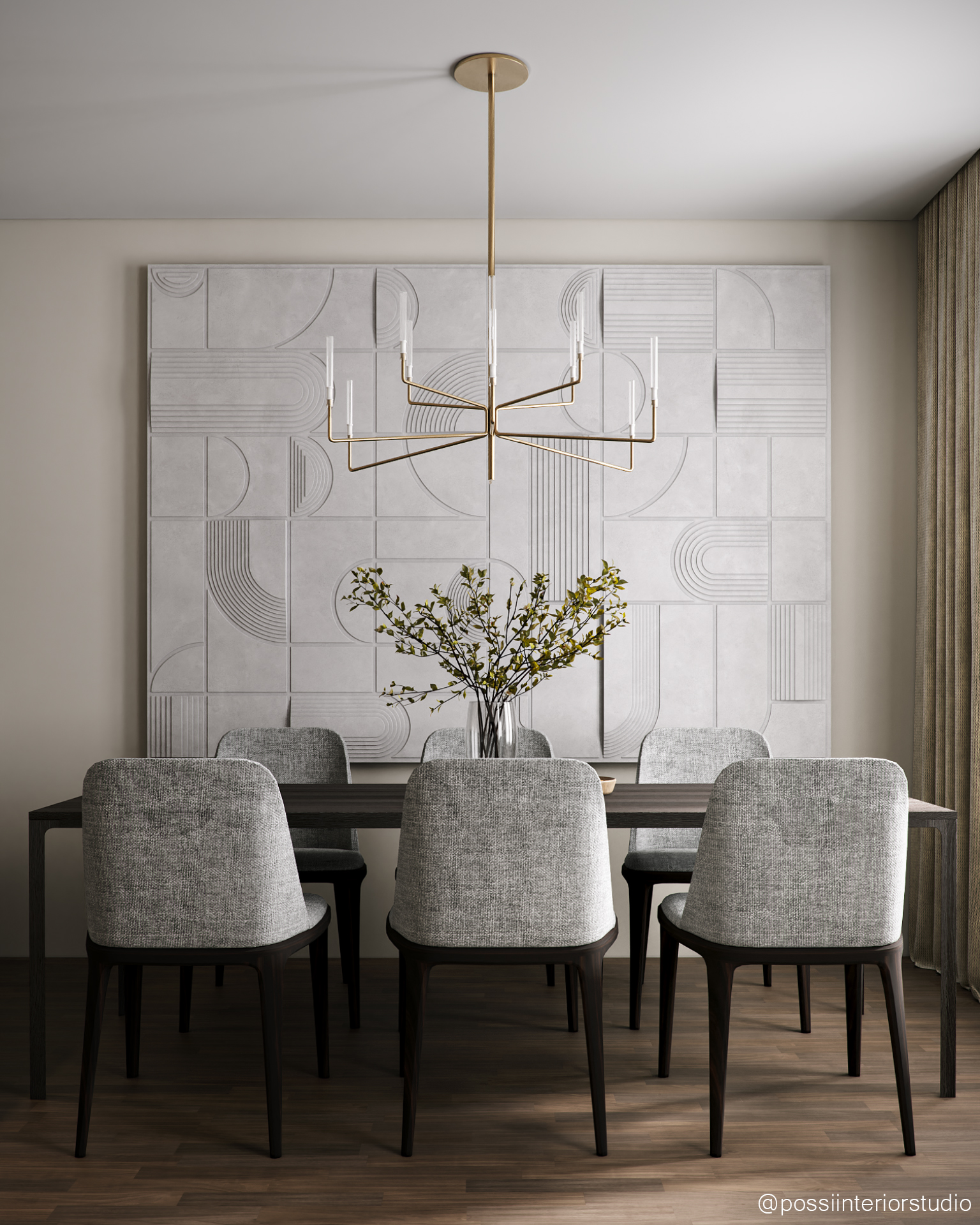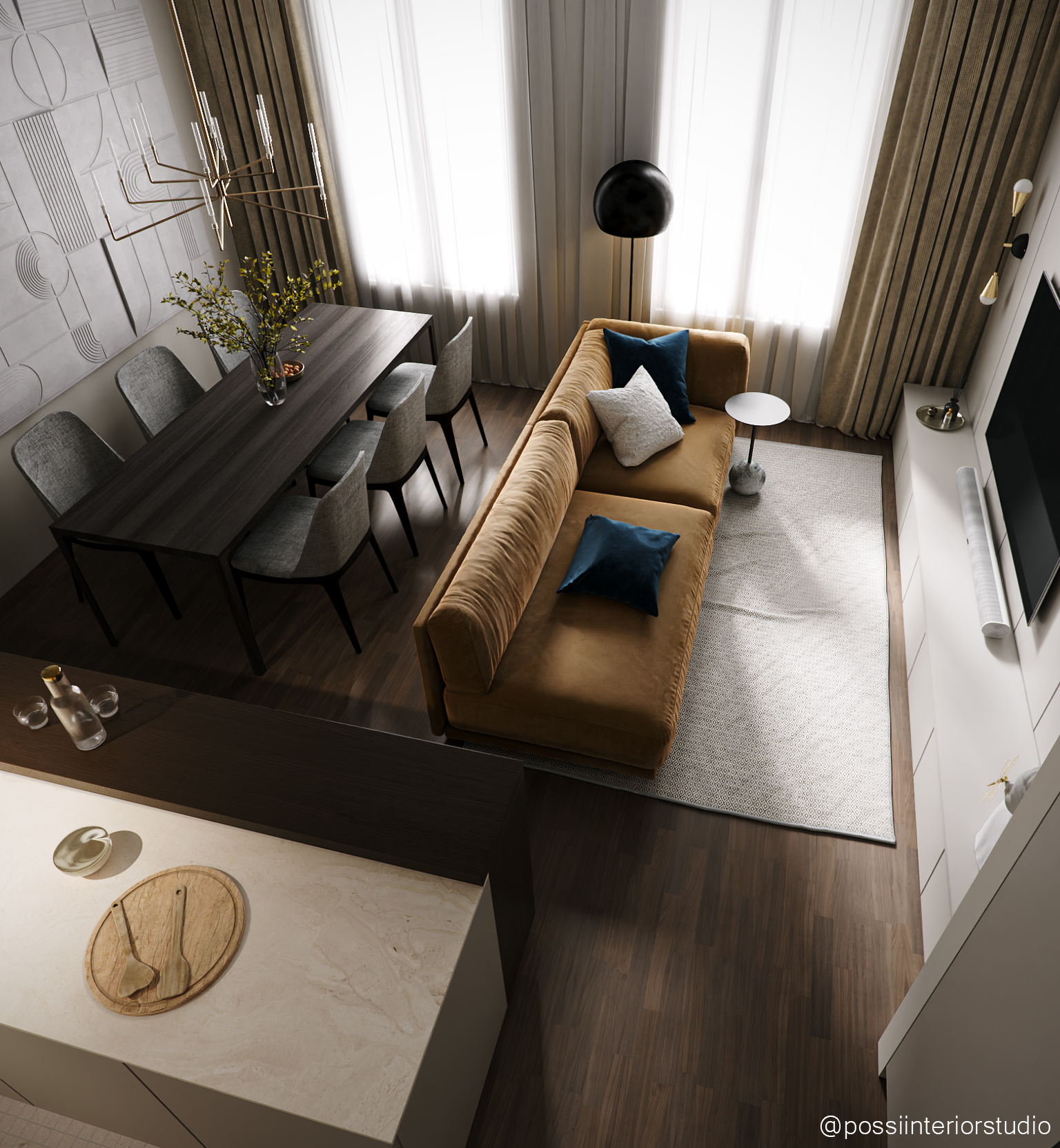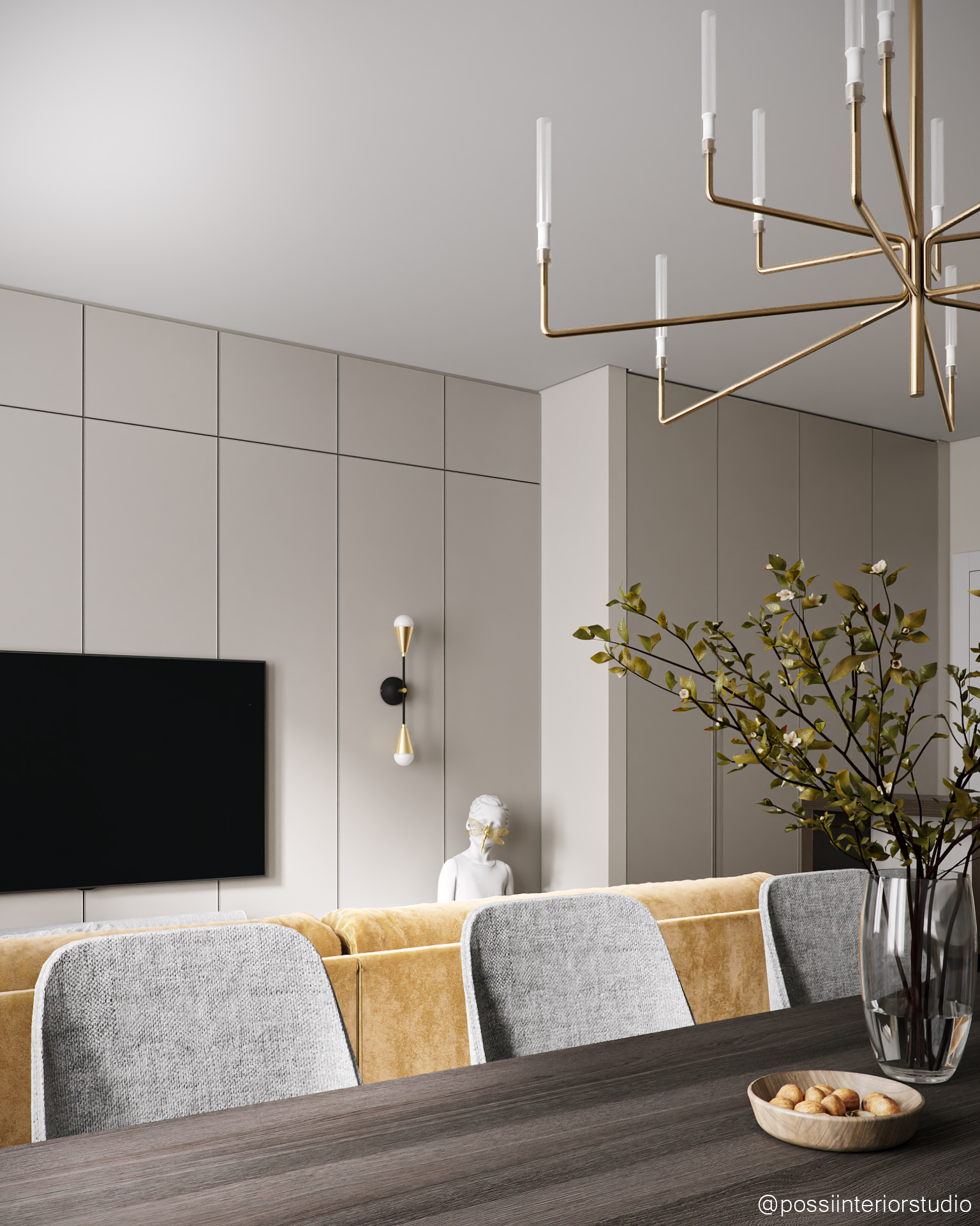 Diese Wohnung vereint Funktionalität und Eleganz in einem ausgewogenen, hellen Raum, in dem Wohn-, Essbereich und Küche fließend ineinander übergehen. Eine neutrale Farbpalette schafft Ruhe, während senfgelbe und goldene Akzente stilvolle Kontraste setzen. Das Design meidet Extreme und findet eine harmonische Balance zwischen Schlichtheit und dezentem Glamour – mit Komfort, Persönlichkeit und Raffinesse bis ins Detail.