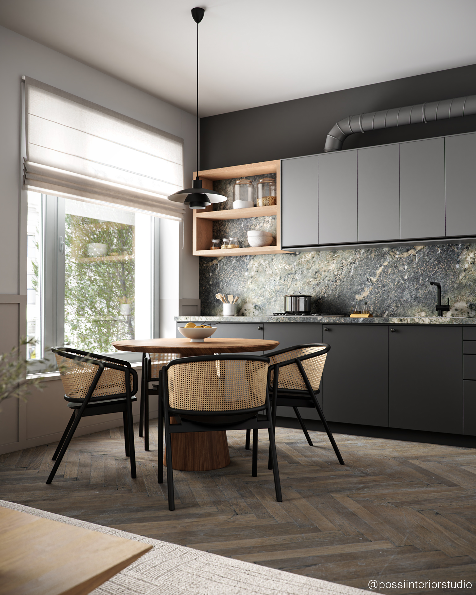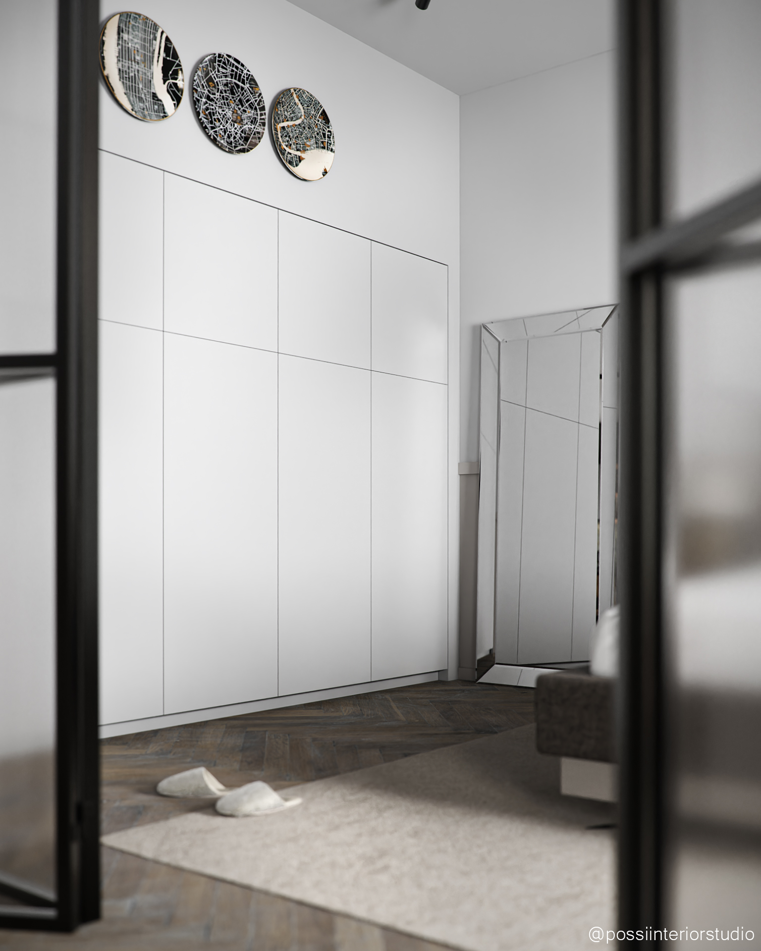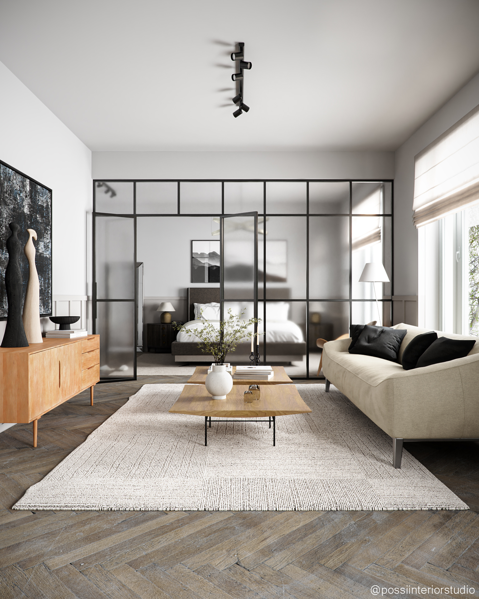 Diese kompakte Wohnung nutzt jeden Quadratmeter intelligent aus. Ohne größere Trennwände gehen die Bereiche – Küche, Wohnzimmer und Schlafzimmer – nahtlos ineinander über und schaffen eine helle und gemütliche Umgebung voller natürlichem Licht und Komfort.